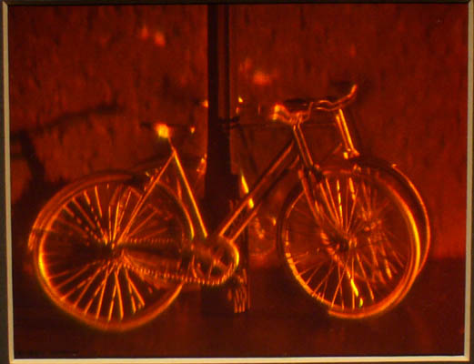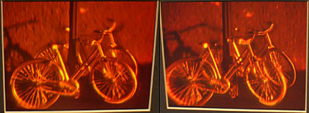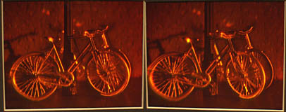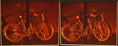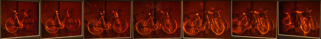 奥行き10cmくらいあります。 質感は本物そっくり。金属そのもの。 手前と後ろに2台の自転車があります。 平面写真だとくっついてよくわからないのですが、 ホログラムを見るとよくわかります。 |
