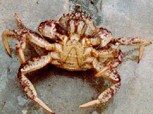 春を感じさせる食べ物といえば、もう一つ、蟹田の名物で、私のハンドルネームになっている毛蟹があります。学名は、トゲ栗蟹と言うそうです。名前のように栗を横に広げたような毛蟹です。北海道産の毛蟹よりは一回り小さいのですが、味は、独特の旨みがあり、ゴールデンウィーク頃のシーズンには、これがないと花見が始まらないと言われているほどです。蟹は湾内一円で採れるのですが、『蟹田の毛蟹』と固有名詞になると高く売れるようで、私の母親も蟹田の毛蟹は、よその町のものより特別美味しいと言って自慢しています。蟹にも足がありますので(10本も!!)隣町へ引っ越しすることもあるので、この説は、多分に論理的ではないと思うのですが・・・・(^^;; 人間と同じように体が大きく、腹が細く、尖った左の方が雄です。(^^;;雌は雄より一回り小さいのですが、蟹ミソが一杯詰まっていて、雄よりおいしく、kg当たりの値段も高いです。 トゲ栗蟹の旬は、青森の桜が満開になる4月下旬から5月初めです。 |