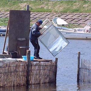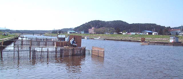 桜が満開になる頃、蟹田川ではヤナが仕掛けられシロラウオ漁が始まります。シロウオはハゼ科の体長5cm程の透明な魚で、刺し身や卵とじ、テンプラなどにして食べます。とくに刺し身は、踊り食いといって、醤油をさし、ワサビ、ネギ、うずらの卵などと混ぜ、生きたまま食べます。口の中でプチプチ跳ねるのを構わず噛んで飲み込んでしまうのです。大変珍味として有名で、3、000円/kgもするのですが、シーズン中は県内各地から春の旬の味を楽しむに多くのお客さんが訪れます。 |
